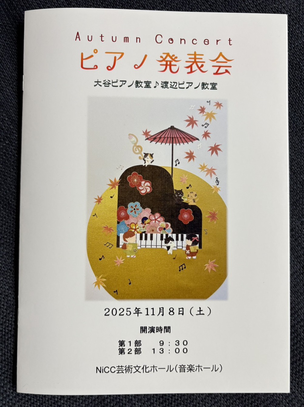 ピアノ発表会を行います。 🎹ピアノ発表会のお知らせ いつも当教室の活動にご理解とご協力を賜り、ありがとうございます。 来週、日頃の練習の成果を披露するピアノ発表会を開催いたします。 一人ひとりが思いを込めて演奏いたしますので、ぜひ温かい拍手をお送りください。 📅 日時:11月8日(土) 第1部 9:30~ 第2部 13:00~ 📍 会場:NiCC芸術文化ホール 皆様のご来場を心よりお待ちしております。